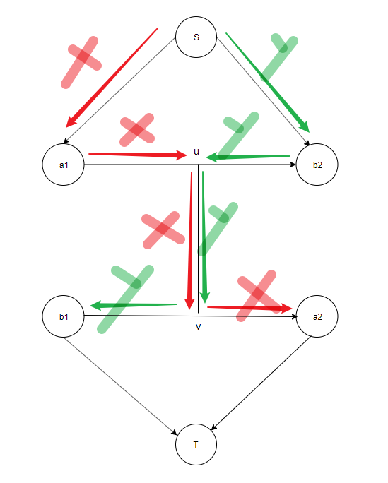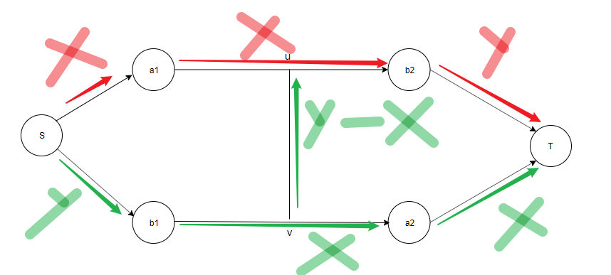 u-v是所有a1-b2和b1-a2的链之间的流量。这样也可以得到最大流但是并不满足题目要求。除非u->v的考研流x+y的流量。