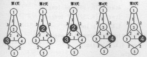 前三天走 1→4→5,后两天走 1→3→5,这样总成本为 (2+2)×3+(3+2)×2+10=32。
