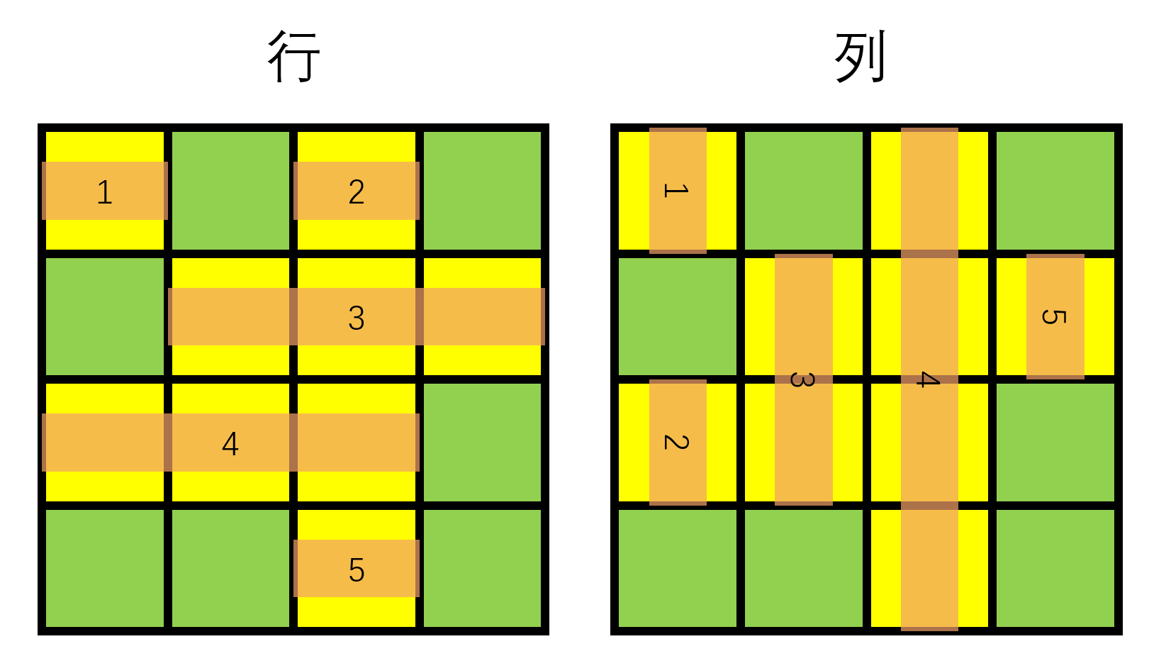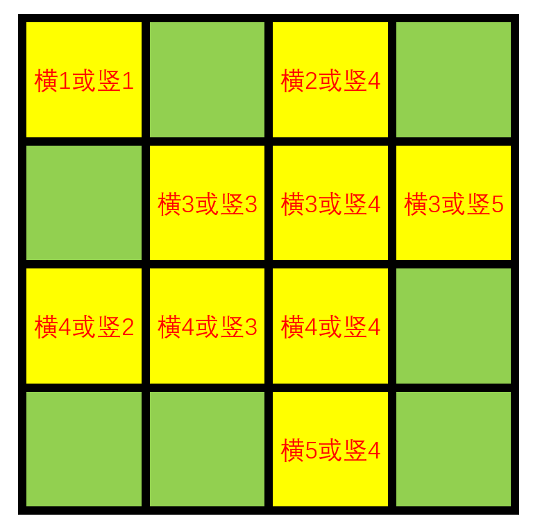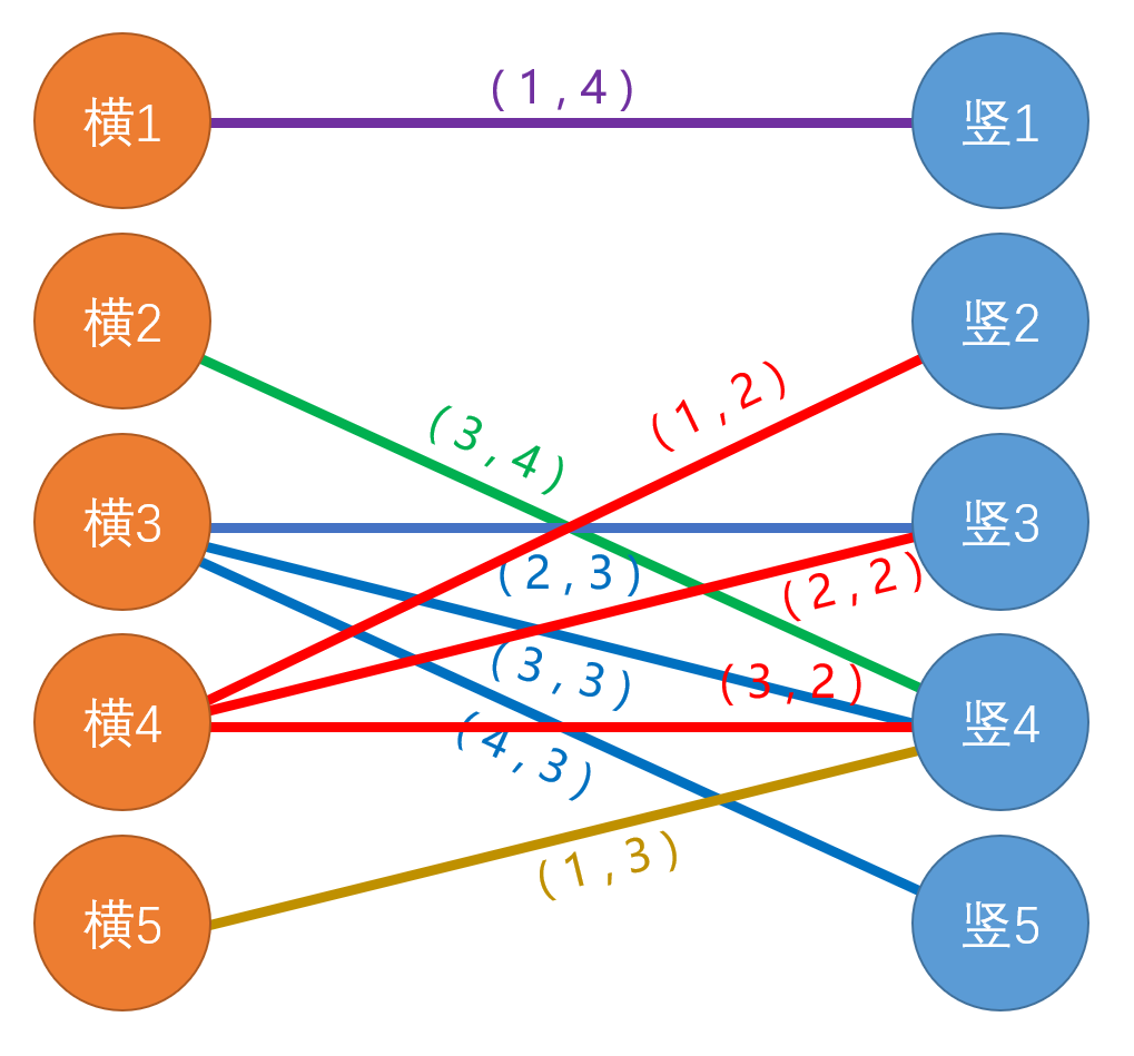 对于每一个点,要么被横着覆盖,要么被竖着覆盖。举例来讲,(3,3)(3,3) 在行上会被横木板 33 覆盖,在列上会被竖木板 44 覆盖。而我们要让所有的点都被覆盖,也就是需要满足下图所示的所有条件: