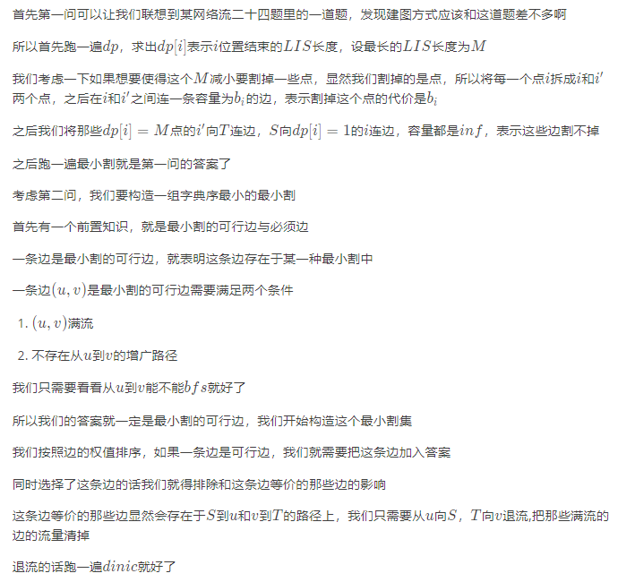 给定序列A,序列中的每一项Ai有删除代价Bi和附加属性Ci。请删除若干项,使得A的最长上升子序列长度减少至少1,且付出的代价之和最小,并输出方案。 如果有多种方案,请输出将删去项的附加属性排序之后,字典序最小的一种。