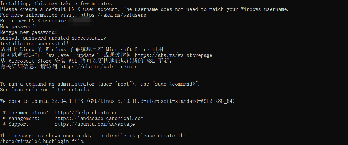 1)安装完WSL,重启电脑; 2)下载 适用于 x64 计算机的 WSL2 Linux 内核更新包:https://wslstorestorage.blob.core.windows.net/wslblob/wsl_update_x64.msi 安装升级后,重新打开 Ubuntu,即可正常访问,效果如下: