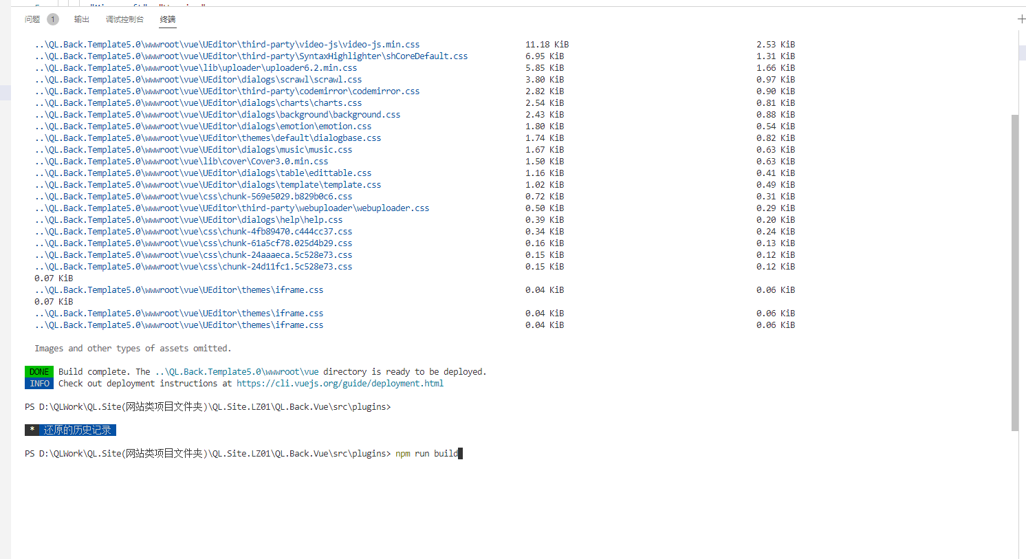 在vue中输入 npm run build用于发布,发布之后会在下面显示发布文件存放位置