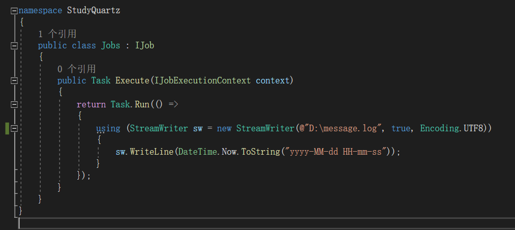 Jobs类中的Execute方法,多线程的向我们的D盘中的message.log文本文件中写入当前时间。