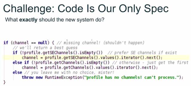 3. 代码是唯一的规范:文档丢失的情况可能会经常出现。即便尚未丢失,它仍然很有可能已经不反映系统的当前状态了,所以说代码是唯一的规范。下面是一个例子,你也可以回想一下那些曾经被你抛弃在角落的代码: