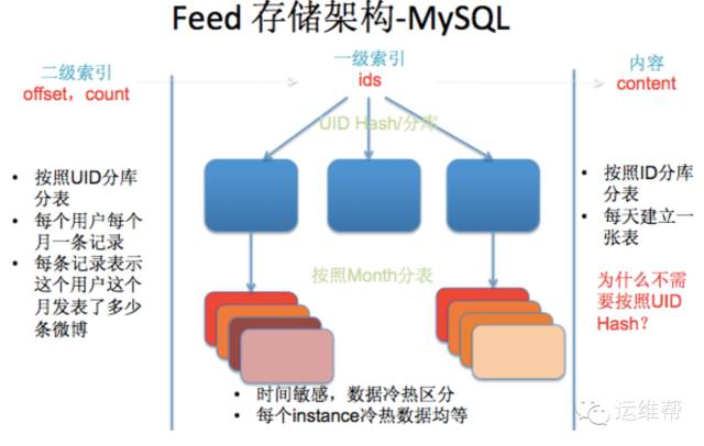 我们来看一下Feed的存储架构,微博的博文主要存在 MySQL中。首先来看内容表,这个比较简单,每条内容一个索引,每天建一张表,其次看索引表,一共建了两级索引。 首先想象一下用户场景,大部分用户刷微博的时候,看的 是他关注所有人的微博,然后按时间来排序。仔细分析发 现在这个场景下, 跟一个用户的自己的相关性很小了。 所以在一级索引的时候会先根据关注的用户,取他们的前条微博ID,然后聚合排序。我们在做哈希(分库分表)的 时候,同时考虑了按照UID哈希和按照时间维度。很业务和时间相关性很高的,今天的热点新闻,明天就没热度了, 数据的冷热非常明显,这种场景就需要按照时间维度做分表,首先冷热数据做了分离(可以对冷热数据采用不同的 存储方案来降低成本),其次, 很容止控制我数据库表的爆炸。像微博如果只按照用户维度区分,那么这个用户所有数据都在一张表里,这张表就是无限增长的,时间长了 查询会越来越慢。二级索引,是我们里面一个比较特殊的场景,就是我要快速找到这个人所要发布的某一时段的微博时,通过二级索引快速定位。