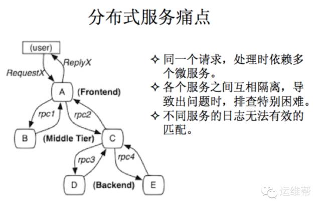 当你发现一个问题的时候,这些日志落在不同的机器 上,你也不知道问题到底出在哪儿,各个服务之间互相隔 离,互相之间没有建立关联。所以导致排查问题基本没有 任何手段,就是出了问题没法儿解决。