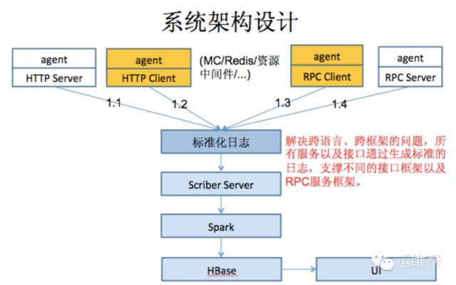 我们要解决的问题,我们刚才说日志互相隔离,我们 就要把它建立联系。建立联系我们就有一个请求ID,然后结合RPC框架, 服务治理功能。假设请求从客户端过来, 其中包含一个ID 101,到服务A时仍然带有ID 101,然后调 用RPC1的时候也会标识这是101 ,所以需要一个唯一的请求ID标识递归迭代的传递到每一个相关节点。第二个, 你做的时候,你不能说每个地方都加,对业务系统来说需 要一个框架来完成这个工作,这个框架要对业务系统是最低侵入原则,用JAVA的话就可以用AOP,要做到零侵入的原则,就是对所有相关的中间件打点,从接口层组件 (HTTP Client、HTTP Server)至到服务层组件(RPC Client、RPC Server),还有数据访问中间件的,这样业 务系统只需要少量的配置信息就可以实现全链路监控 。为什么要用日志?服务化以后,每个服务可以用不同的开发 语言,考虑多种开发语言的兼容性,内部定义标准化的日志是唯一且有效的办法。