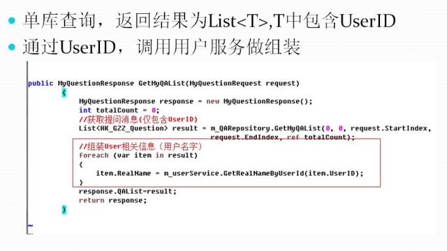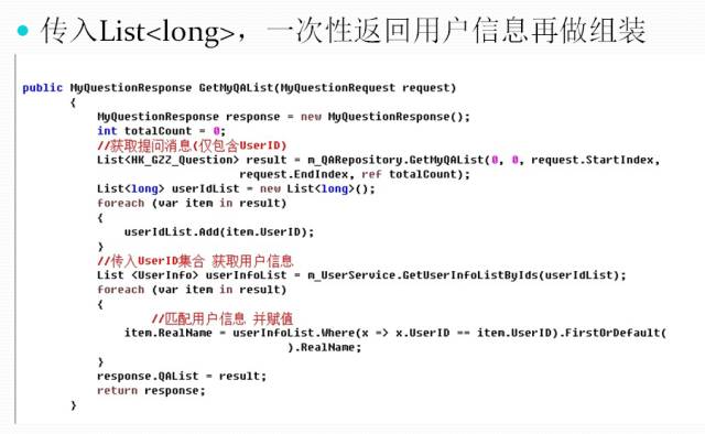 伪代码很容易理解,先获取“我的提问列表”数据,然后再根据列表中的UserId去循环调用依赖的用户服务获取到用户的RealName,拼装结果并返回。