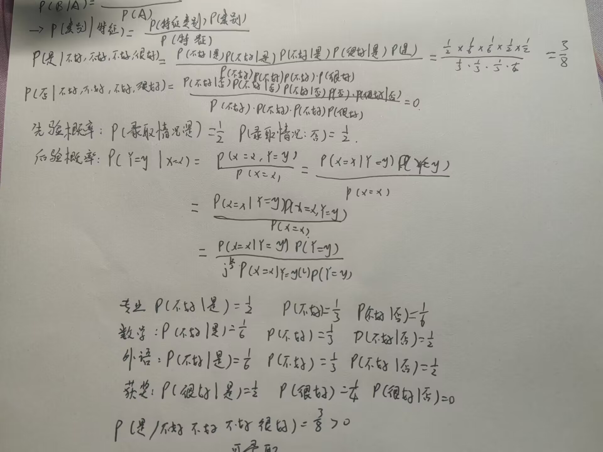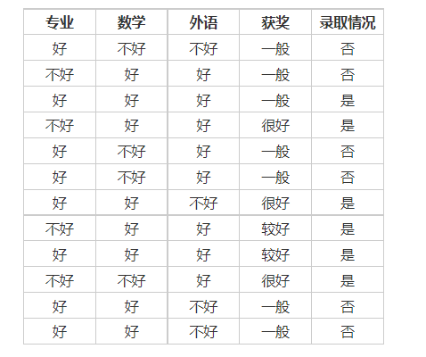 1.下表中是某大学一位研究生导师带过的硕士研究生录取情况表,根据该表建立朴素贝叶斯模型,现有一名上线考生想报考该导师,考生的特点是专业、数学和外语都不好,获奖情况很好,请你判断该生能否被录取。