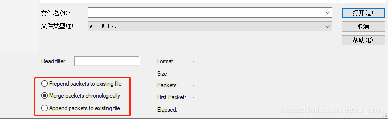 - Append packets to existing file:将待打开pcap文件的报文插入到已打开pcap文件的末尾