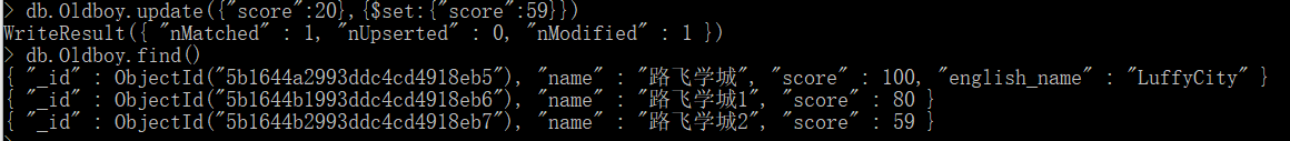 再做一个例子:把 "score" 为 100 分 的 "english_name" 赋值为 "LuffyCity"