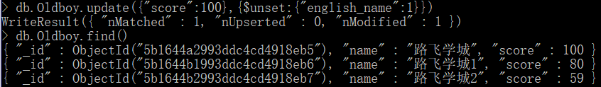 成功了! {$unset:{"english_name" : 1}} 就是删除 "english_name" 这个 field, 相当于关系型数据库中删除了english_name字段
