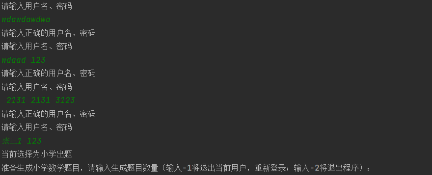 可以看出在登陆时随便输入的字符串系统会检测出来并提示用户输入正确的用户名以及密码,在生成数学题时如果输入不符合规范会检测到并提示用户输入正确的范围或指令。由此看出程序的安全性和可靠性还是比较高的。