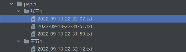 public File makeFile() { String mkPath = "paper\\" + this.getUsername(); File file = new File(mkPath); Date date = new Date(); // 时间处理 用于txt文件的名称 SimpleDateFormat simpleDateFormat = new SimpleDateFormat("yyyy-MM-dd-HH-mm-ss"); String title = simpleDateFormat.format(date) + ".txt"; if (!file.exists()) { // 单例模式 如果没有对应文件夹则生成 file.mkdirs(); } File paper = new File(mkPath, title); try { paper.createNewFile(); } catch (IOException e) { e.printStackTrace(); } return paper; }此方法可以在对应路径下生成文件夹以及txt文件,其中判断没有文件夹就生成这部分做的比较细致,考虑周全,值得学习。