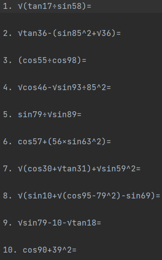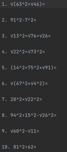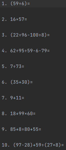 public void makePrimaryTitle(Random random, StringBuffer stringBuffer) { // 判断括号配对 int bracket = 0; // 操作数最多个数 int cnt = 5; // 保证操作数不超过5个 while (cnt-- > 0) { // 判断是否本轮退出 boolean quit = elementMaker.quitOrNot(random, cnt); // 随机加入 ( Object[] objects = elementMaker.addLeftBracket(bracket, random, quit, stringBuffer); Boolean leftBracketOrNot = (Boolean) objects[0]; bracket = (Integer) objects[1]; // 加入数字 elementMaker.addNum(random, stringBuffer); // 判断 加入 ) bracket = elementMaker.addRightBracket(bracket, random, leftBracketOrNot, stringBuffer); // 随机结束算式 if (quit) { break; } // 随机生成符号 elementMaker.addSymbol(random, stringBuffer); } // 补全 ) elementMaker.closeBrackets(bracket, stringBuffer); // 输出 = stringBuffer.append("="); }该方法实现了小学题目的制造,可以看出整个方法中大部分都在调用方法,xr同学对代码的封装性还是很强的,值得学习。初中和高中的题目制造方法类似,这里不做过多说明。