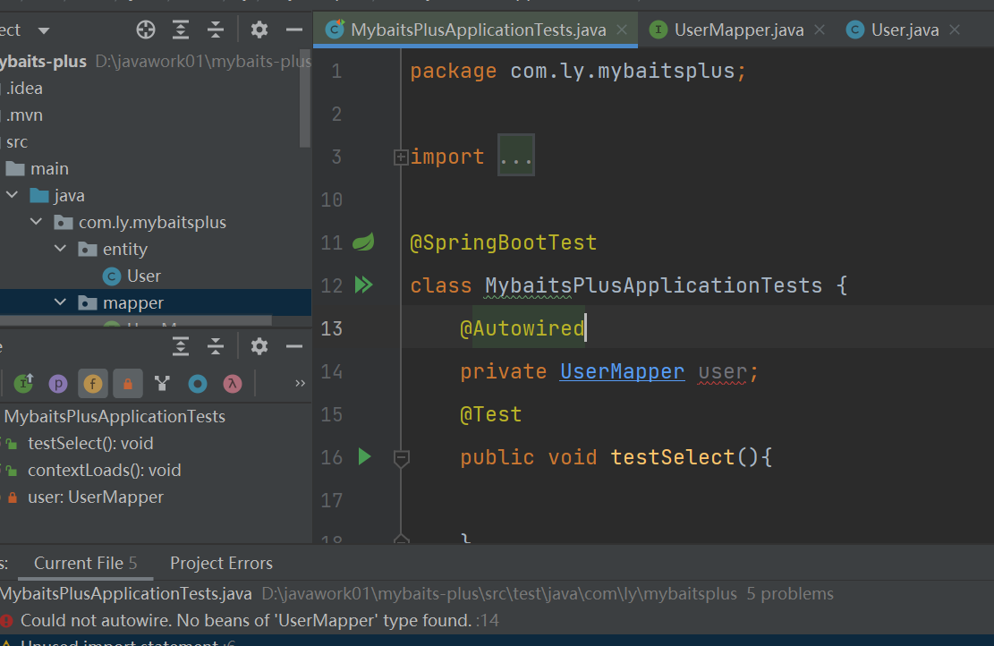 个人理解: 因@Autowired 是按照byType装配的,mybaits-plus 没有实现类pojo,而是框架通过反射机制映射出来的实体对象类;