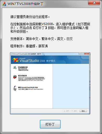 在Windows 7下,VS2008试用版无法正常升级到正式版。原因是维护页面的注册码输入框和升级按钮被隐藏。通过本补丁,可让注册码输入框和升级按钮恢复正常显示。