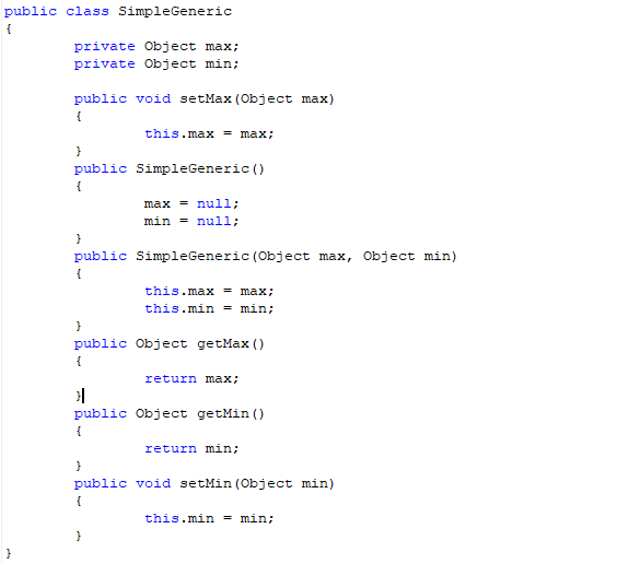 1 public class SimpleGeneric<T>{ 2 public void setMax(T max) { 3 this.max = max; 4 } 5 6 private T max; 7 private T min; 8 9 public SimpleGeneric() { 10 max = null; 11 min = null; 12 } 13 14 public SimpleGeneric(T max, T min) { 15 this.max = max; 16 this.min = min; 17 } 18 19 public T getMax() { 20 return max; 21 } 22 23 public T getMin() { 24 return min; 25 } 26 27 public void setMin(T min) { 28 this.min = min; 29 } 30 31 }