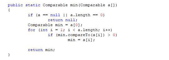 1 public static <T extends Comparable> T min(T[] a) { 2 if(a == null || a.length ==0) 3 return null; 4 T min = a[0]; 5 for(int i =1;i < a.length;i++) { 6 if(min.compareTo(a[i]) > 0) 7 min = a[i]; 8 } 9 return min; 10 }