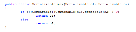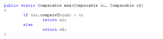1 public static <T extends Serializable & Comparable> T max(T o1, T o2) { 2 if (o1.compareTo(o2) > 0) { 3 return o1; 4 } else { 5 return o2; 6 } 7 } 8 public static <T extends Comparable & Serializable> T max(T o1 ,T o2){ 9 if(o1.compareTo(o2)>0) { 10 return o1; 11 }else { 12 return o2; 13 } 14 }
