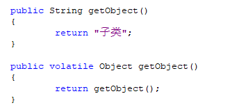 1 class A{ 2 public Object getObject() { 3 return "父类"; 4 } 5 6 } 7 class B extends A{ 8 @Override 9 public String getObject() { 10 return "子类"; 11 } 12 }