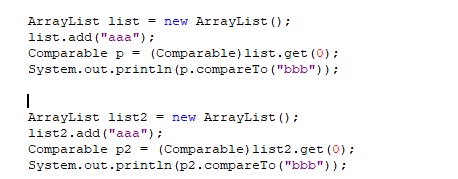 1 ArrayList list = new ArrayList(); 2 list.add("String"); 3 String string = (String) list.get(0); 4 System.out.println(string); 5 6 ArrayList<String> list2 = new ArrayList<>(); 7 list2.add("泛型类"); 8 String string2 = list2.get(0); 9 System.out.println(string2);