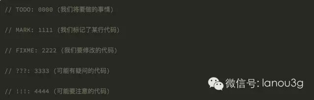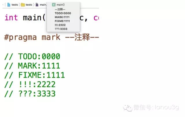 实际上,给代码加注释的时候,我们可以给注释加上一些标识符,这些标识 符能够被Xcode识别,起到类似于#pragma mark的作用。