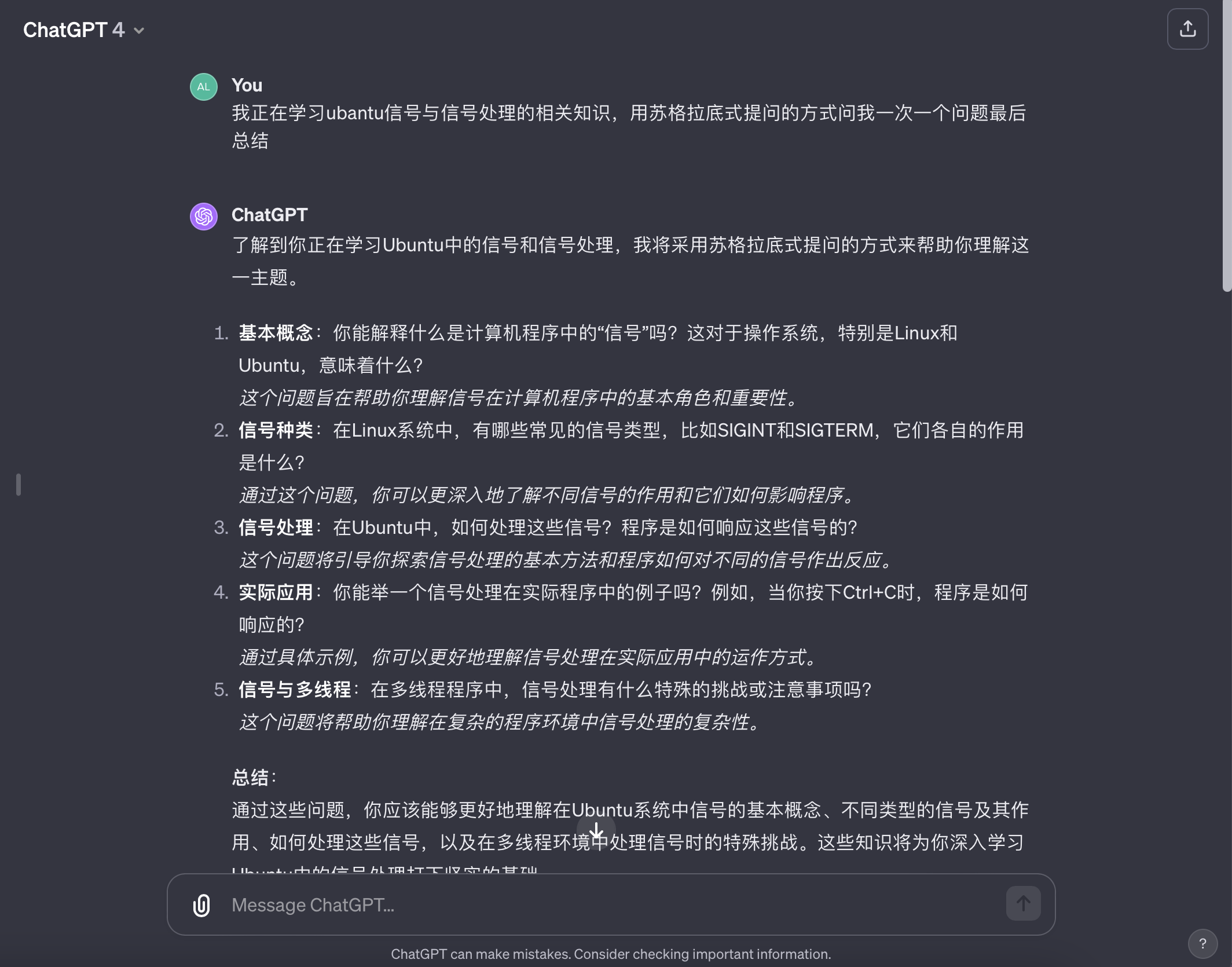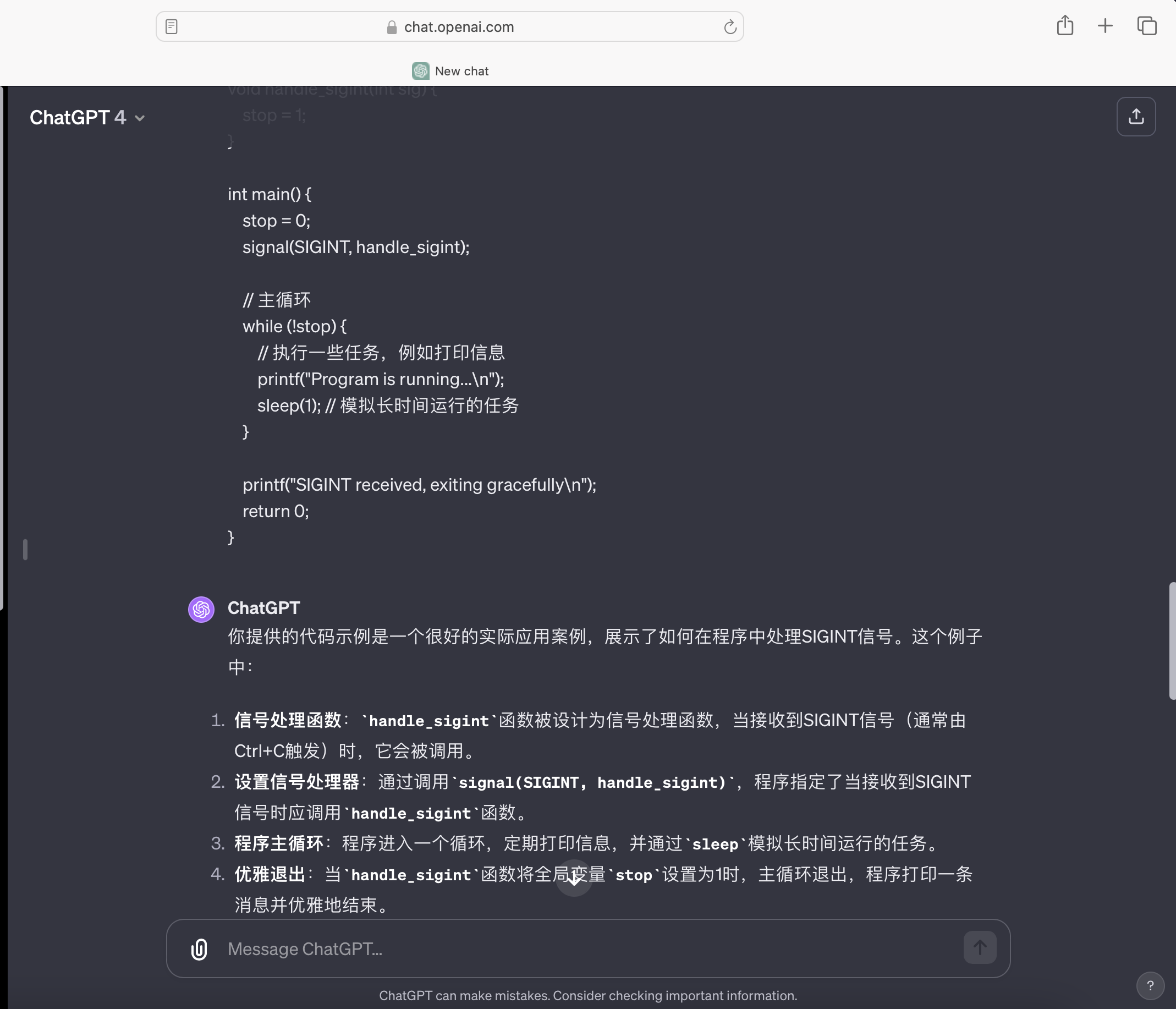 让我们看一个简单的信号处理示例。下面的 C 代码展示了如何捕捉和处理 SIGINT 信号:
