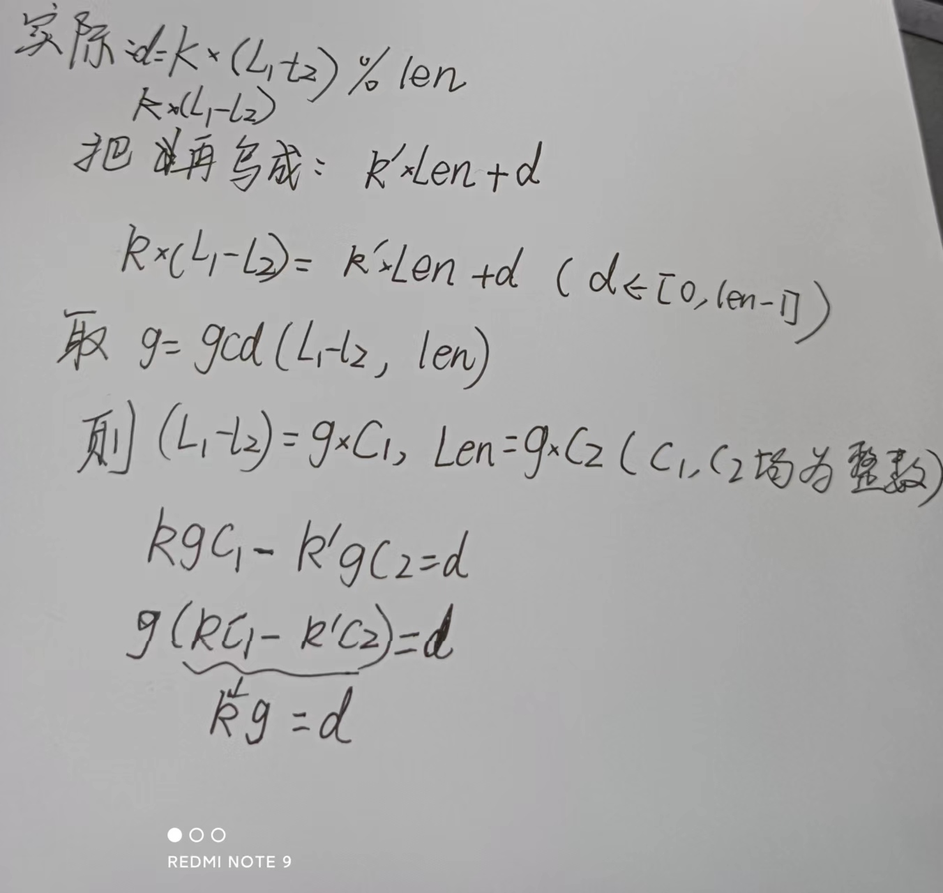 题解在这边写的是d=gcd(s.length(),L1-L2),最多位移n/d次,在这边看了好久,自己推了一下应该是因为: