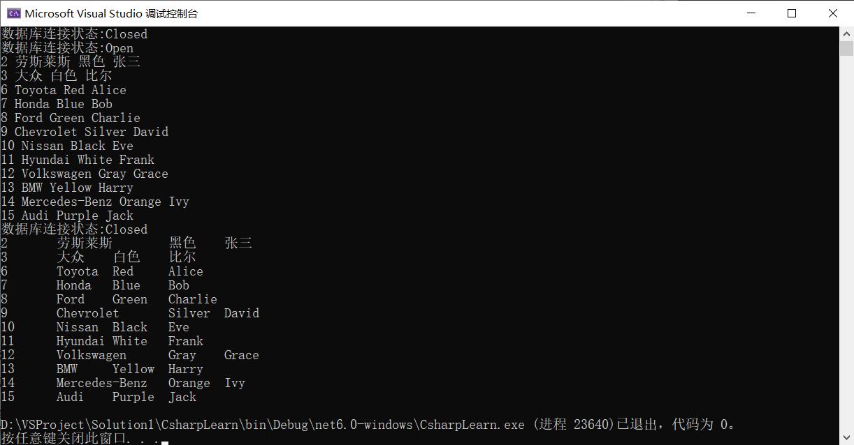 Console.WriteLine("数据库连接状态:" + connection.State);