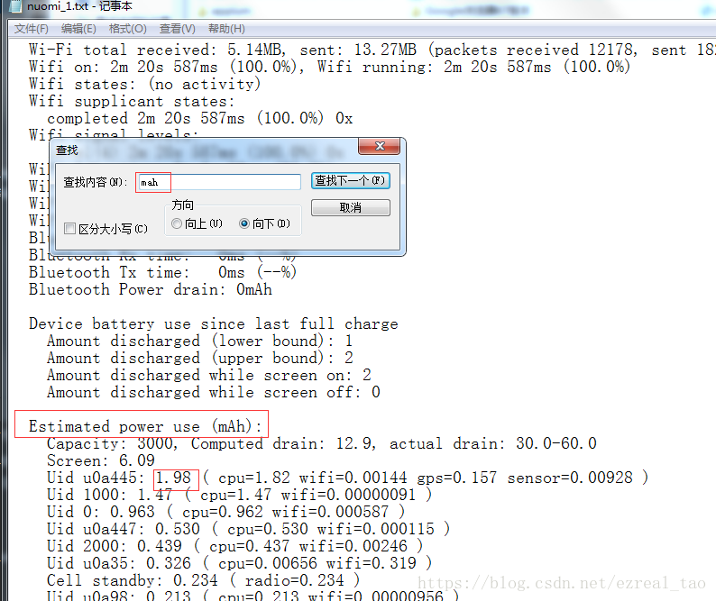 9.打开记录的txt文件,查找耗电量信息,如下图,1.98mah(毫安时)就是该业务场景的耗电量