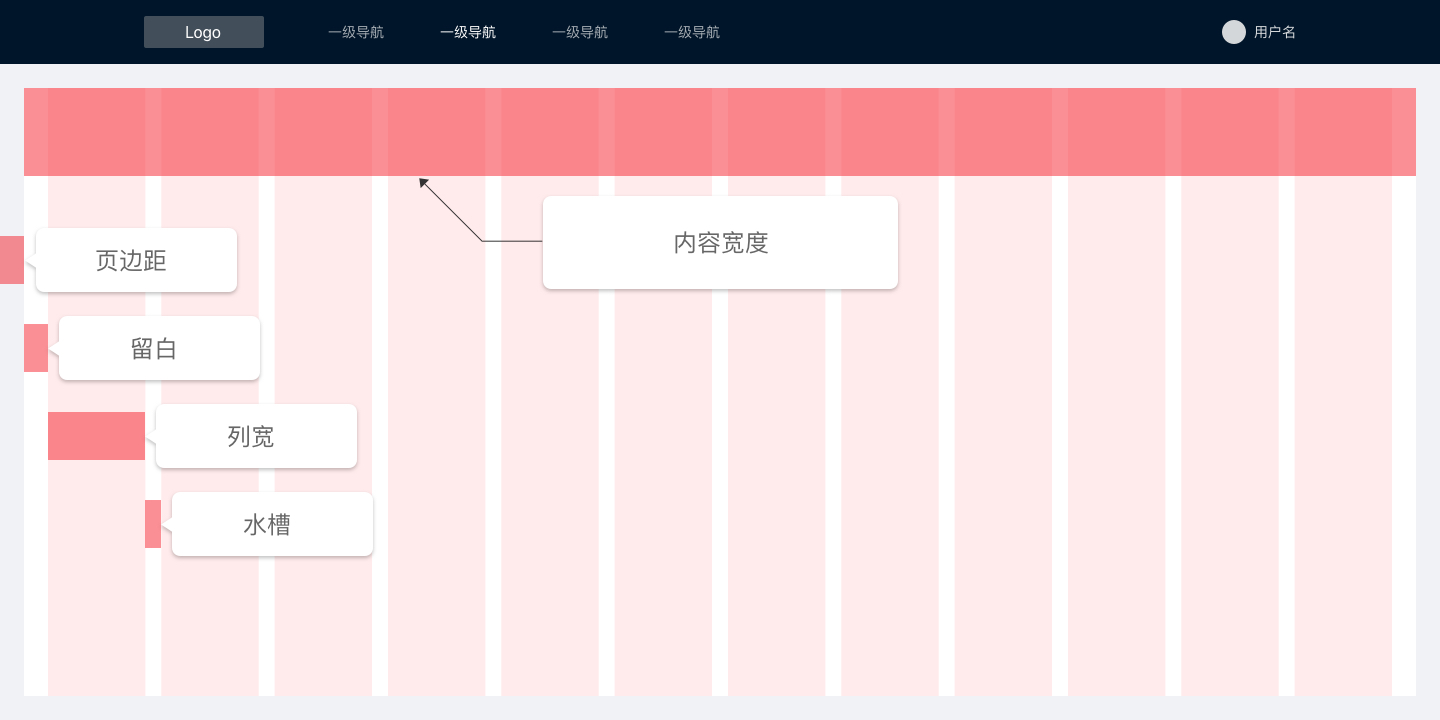 4、水槽(Gutter),水槽就是列和行的分割间距,水槽越大页面布局间距就越大,水槽越小页面就越紧凑。水槽的宽度是8n,也就是水槽可以以8为基本单位去增加或减小。为了减少设计决策成本,我们会事先设定好一系列水槽宽度,并定义好每个宽度对应的使用场景,然后根据每个场景使用对应数值就可以了。比如8、16、 24、32 、40。根据实践经验,正常情况下,两个模块间距(水槽)的值为24时,视觉上是最为舒适。比如Ant design中的设计水槽就是24px
