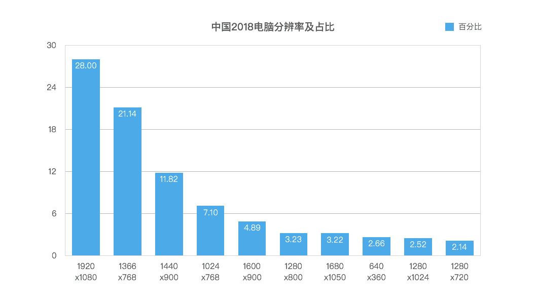 从图中我们可以看出,目前国内 PC端用户屏幕分辨率排名前三的分别是1920*1080、1366*768、1400*900;他们三者之和为60.96%,占了很大的比例。