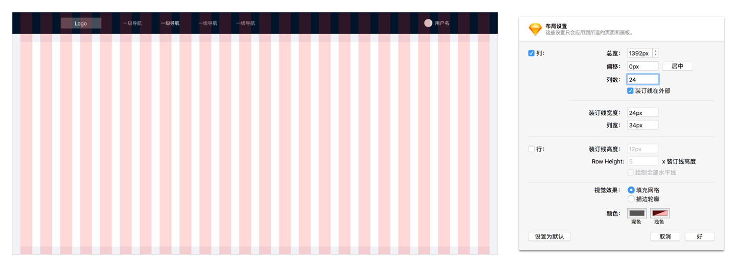 第1种,是采用sketch自带的工具,在显示-画布-布局设置,找到布局设置界面,可以根据自己的需要设置。但是有个缺点,就是这个布局是该页面全局的,不能针对某一块设定。如下图