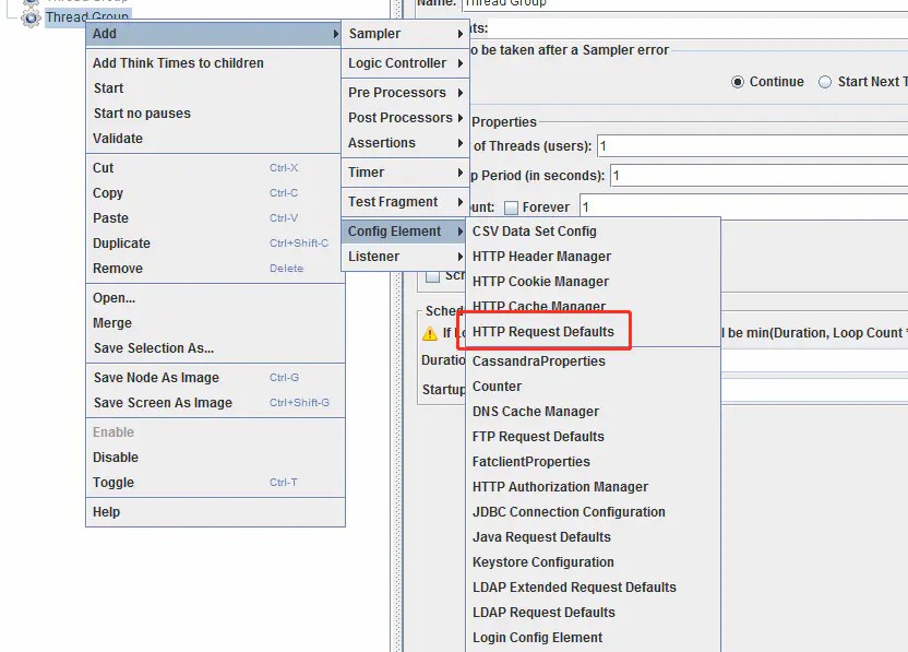线程组右键---添加---配置原件---http请求默认