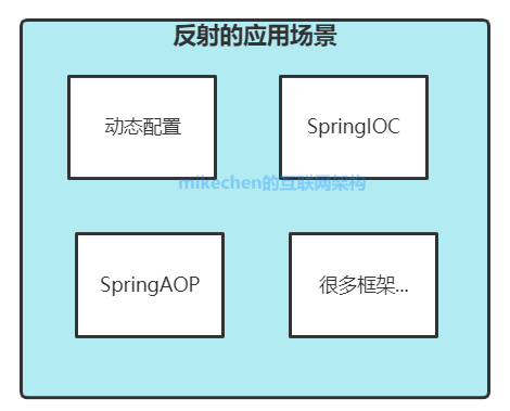 举个例子我们的项目底层数据库有时是用mysql,有时用oracle,需要动态地根据实际情况加载驱动类,这个时候反射就有用了,假设 com.mikechen.java.myqlConnection,com.mikechen.java.oracleConnection这两个类我们要用。