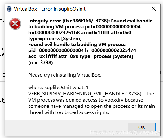 win10 Oracle VirtualBox 启动虚拟机报错virtualbox error in suplibosinit 3738; found evil handle to budding Found evil handle to budding VM process