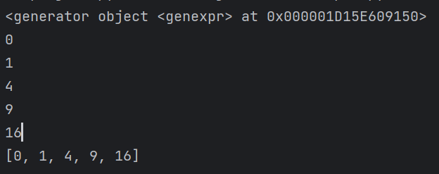 # 生成器表达式 generator = (x * x for x in range(5)) print(generator) for i in generator: # 通过 for循环迭代生成器 print(i) # 请区分列表表达式语句 theList = [x * x for x in range(5)] print(theList)