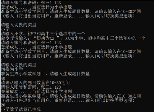 在命令行根据提示输入账号和密码,如:王五1 123 用空格隔开,如果账号和密码输入正确,就提示登录成功,准备生成xx类型的卷子,然后输入一个数字,根据输入数字的不同分为以下三种情况: