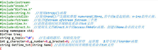 1、运用了数据结构——树(Anode.h和Bintree.h),编写了树的存储和遍历函数,用于之后题目的生成(定义一个$符号用于调用inorder函数使g_topic字符串成为合法的算术题目并且加上括号逻辑)。