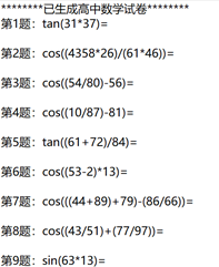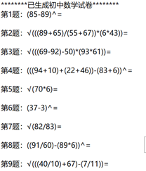 1、生成初中试卷的时候,根号√只能加在题目的开头位置,平方^只能加在题目的最后。同样地,生成高中卷子的时候,sin,cos,tan符号也只能出现在题目的开头位置。因此可选择的题目类型不是很多。