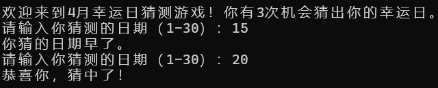 printf("很遗憾,你的3次机会已用完。你在4月的幸运日是:%d\n", luckyDay);