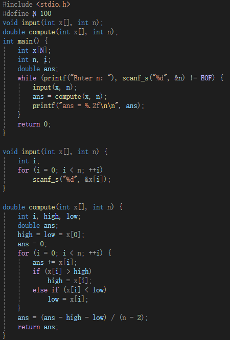 input功能是从标准输入读取n个整数,并存储到数组x中;compute的功能是计算数组x中所有元素的平均值,但排除最大值和最小值后的平均值(即去掉一个最高分和一个最低分后的平均分)。