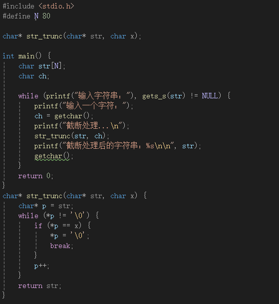 输入截断字符后按回车,下一轮循环的程序输出异常(如直接跳过输入或输出空行);getchar() 的作用:确保输入缓冲区中无残留的 \n,避免影响后续 gets(str) 的读取。