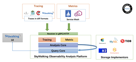 SkyWalking 的核心是数据分析和度量结果的存储平台,通过 HTTP 或 gRPC 方式向 SkyWalking Collecter 提交分析和度量数据,SkyWalking Collecter 对数据进行分析和聚合,存储到 Elasticsearch、H2、MySQL、TiDB 等其一即可,最后我们可以通过 SkyWalking UI 的可视化界面对最终的结果进行查看。Skywalking 支持从多个来源和多种格式收集数据:多种语言的 Skywalking Agent 、Zipkin v1/v2 、Istio 勘测、Envoy 度量等数据格式。