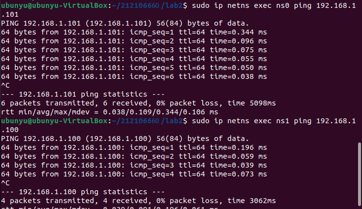 - ovs-vsctl基础操作实践:创建OVS交换机,以ovs-xxxxxxxxx命名,其中xxxxxxxxx为本人学号。在创建的交换机上增加端口p0和p1,设置p0的端口号为100,p1的端口号为101,类型均为internal;为了避免网络接口上的地址和本机已有网络地址冲突,需要创建虚拟网络空间(参考命令netns)ns0和ns1,分别将p0和p1移入,并分别配置p0和p1端口的ip地址为190.168.1.100、192.168.1.101,子网掩码为255.255.255.0;最后测试p0和p1的连通性。
