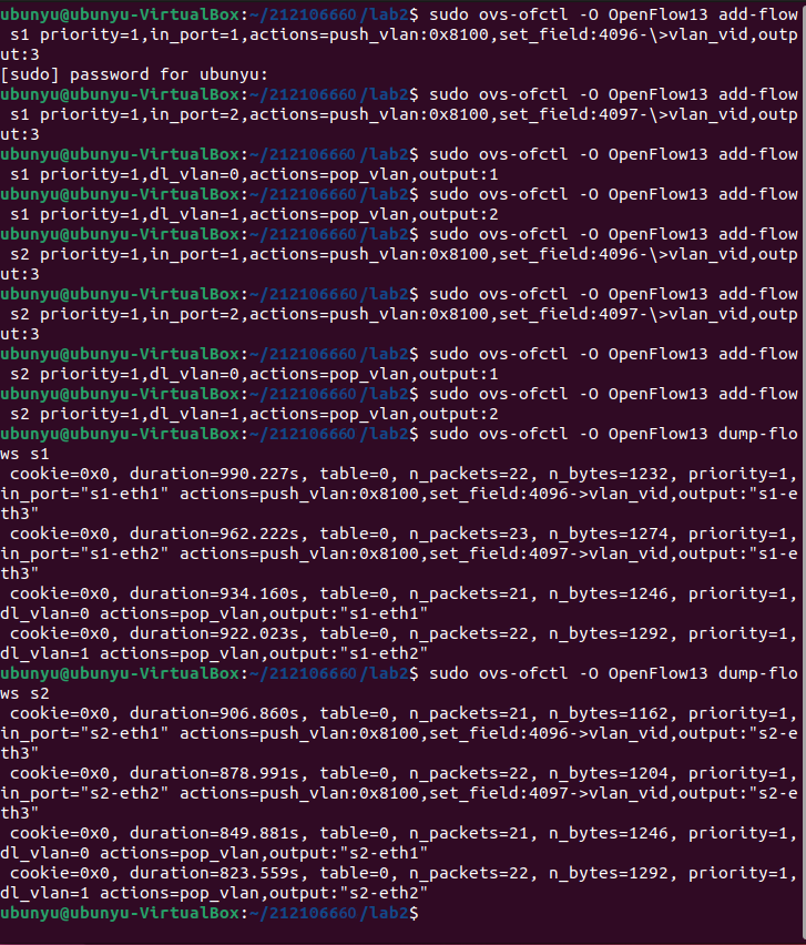 - 通过命令行终端输入“ovs-ofctl”命令,直接在s1和s2上添加流表,划分出所要求的VLAN。