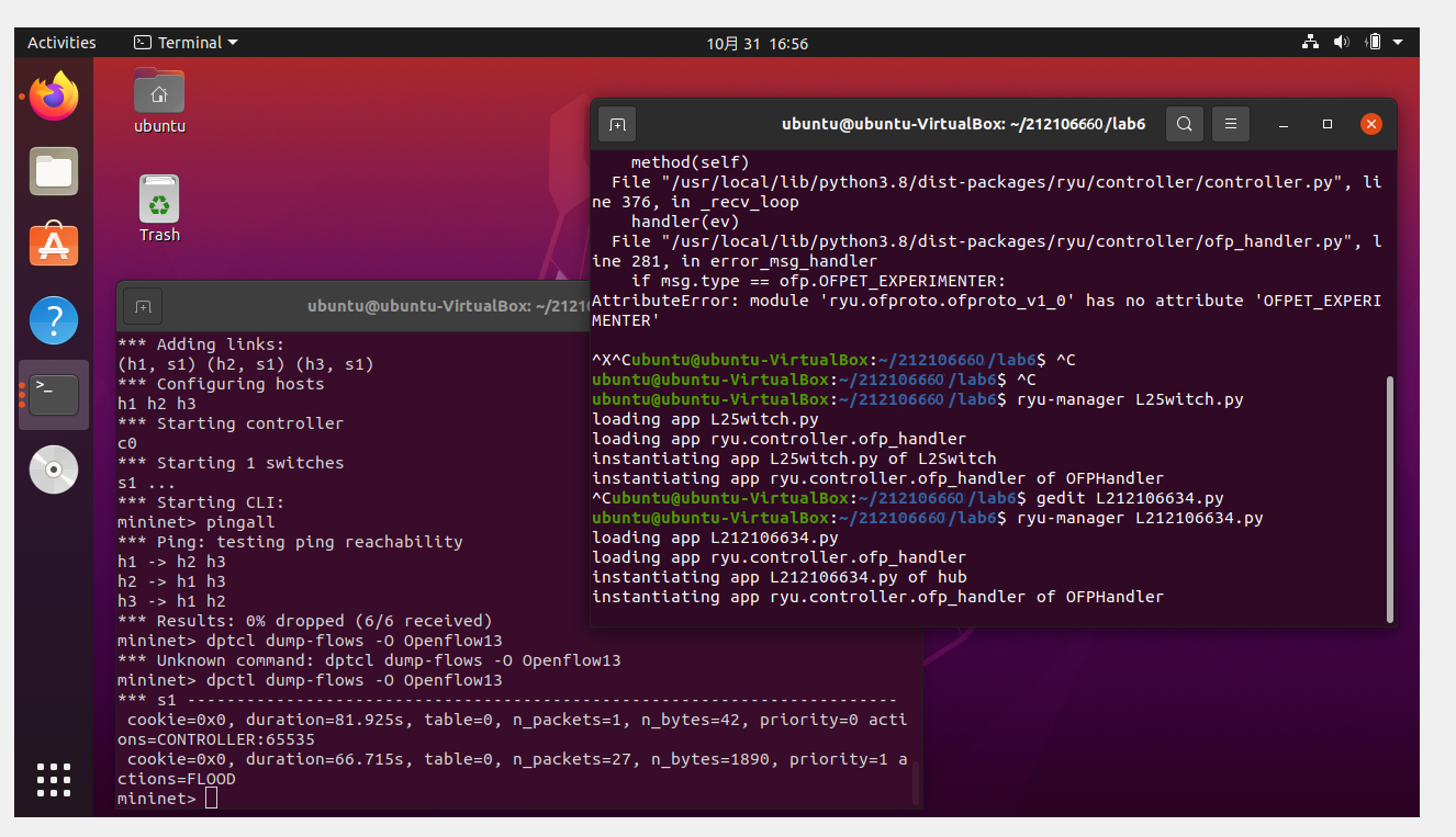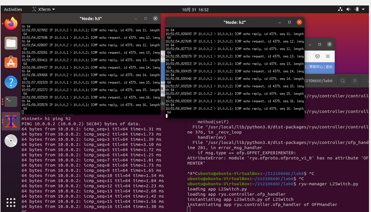 2.阅读Ryu文档的The First Application一节,运行当中的L2Switch,h1 ping h2或h3,在目标主机使用 tcpdump 验证L2Switch,分析L2Switch和POX的Hub模块有何不同 创建L2Switch.py文件,并保存在目录/home/用户名/学号/lab6/中