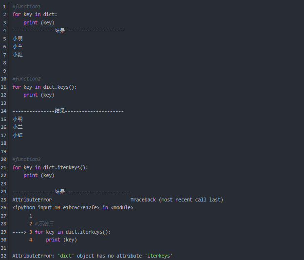 可以看到,这里对字典key值的遍历,有三种方法,其中第三种方法报错了,这是因为小白使用的是PY3版本,在python3中keys()的方法替代了iterkeys()方法,如果是用python2版本是可以的,不过小白建议掌握python3里的方法,毕竟python2之后用的会越来越少。