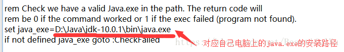 意思是:如果找不到,就跳转到CheckFailed,也就是出现刚才运行find_java.bat时出现的错误的内容而上一句for /f "delims=" %%a in ('"%~dps0\find_java%arch_ext%.exe" -s') do set java_exe=%%a我猜是: for循环找到java.exe的路径(%%a),并将%%a设置到java_exe(set java_exe=%%a)于是乎,我把前面找的部分(for循环)直接删掉,并直接告诉它java.exe在那。修改之后: